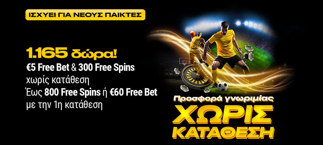 - Κάθε παίκτης δικαιούται μέχρι ένα Free Bet αξίας €5 και 300 Free Spins συνολικά κατά τη διάρκεια της προσφοράς.